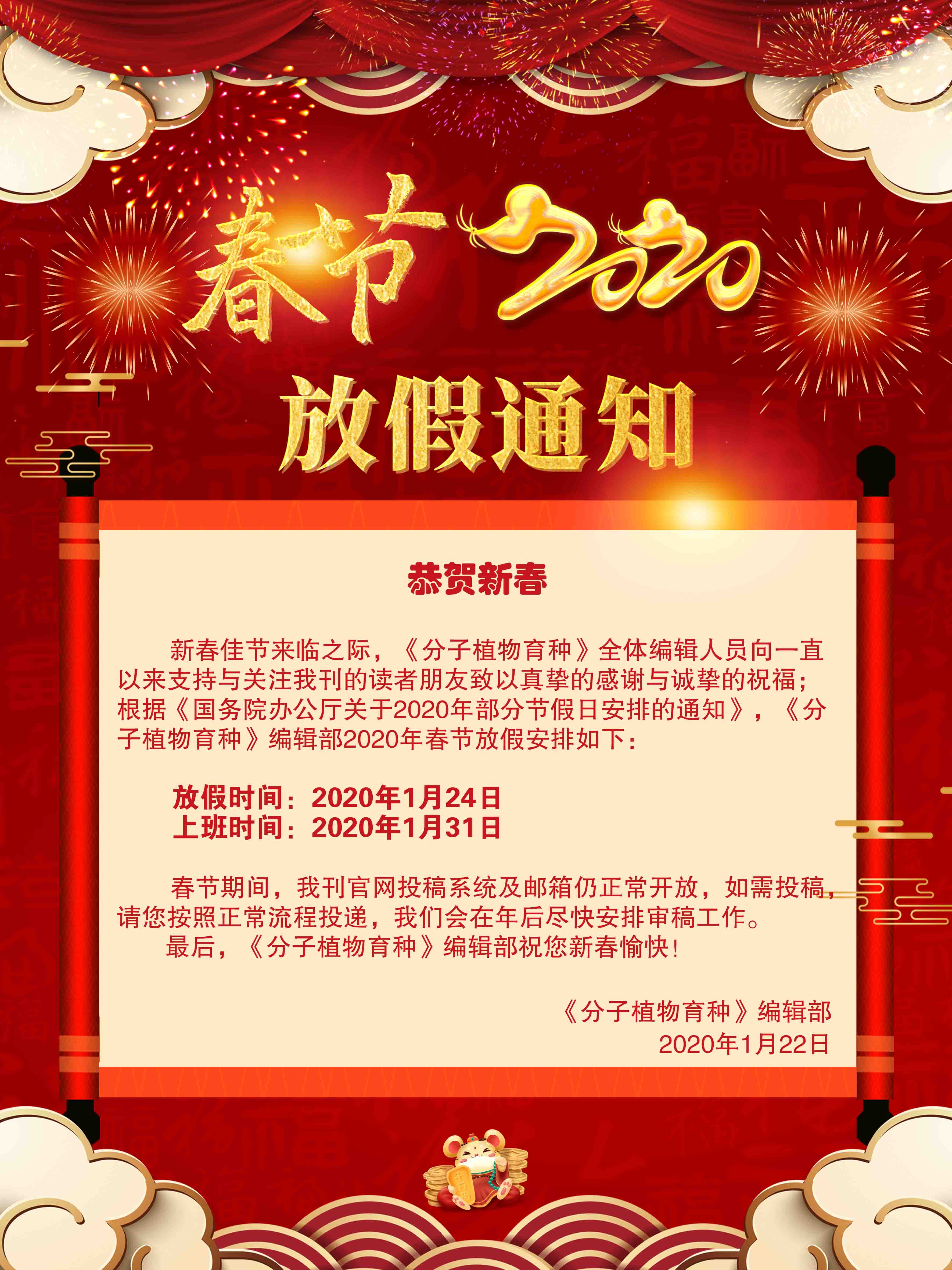 关于《分子植物育种》编辑部2020年春节放假通知