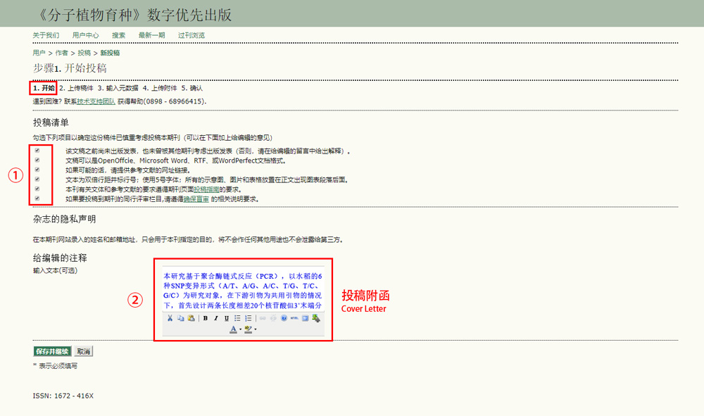 1、开始投稿:本刊投稿第一步,首先如图①处,红色框框的选项,全打勾√。在②处,提交投稿附函(Cover Letter)。①,②项是必填项。