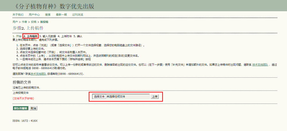 2、上传稿件:本刊投稿第二步,在上传投稿文件处上传Word手稿,文件大小不能超8 MB (文件后缀.doc或者.docx),如图所示。
