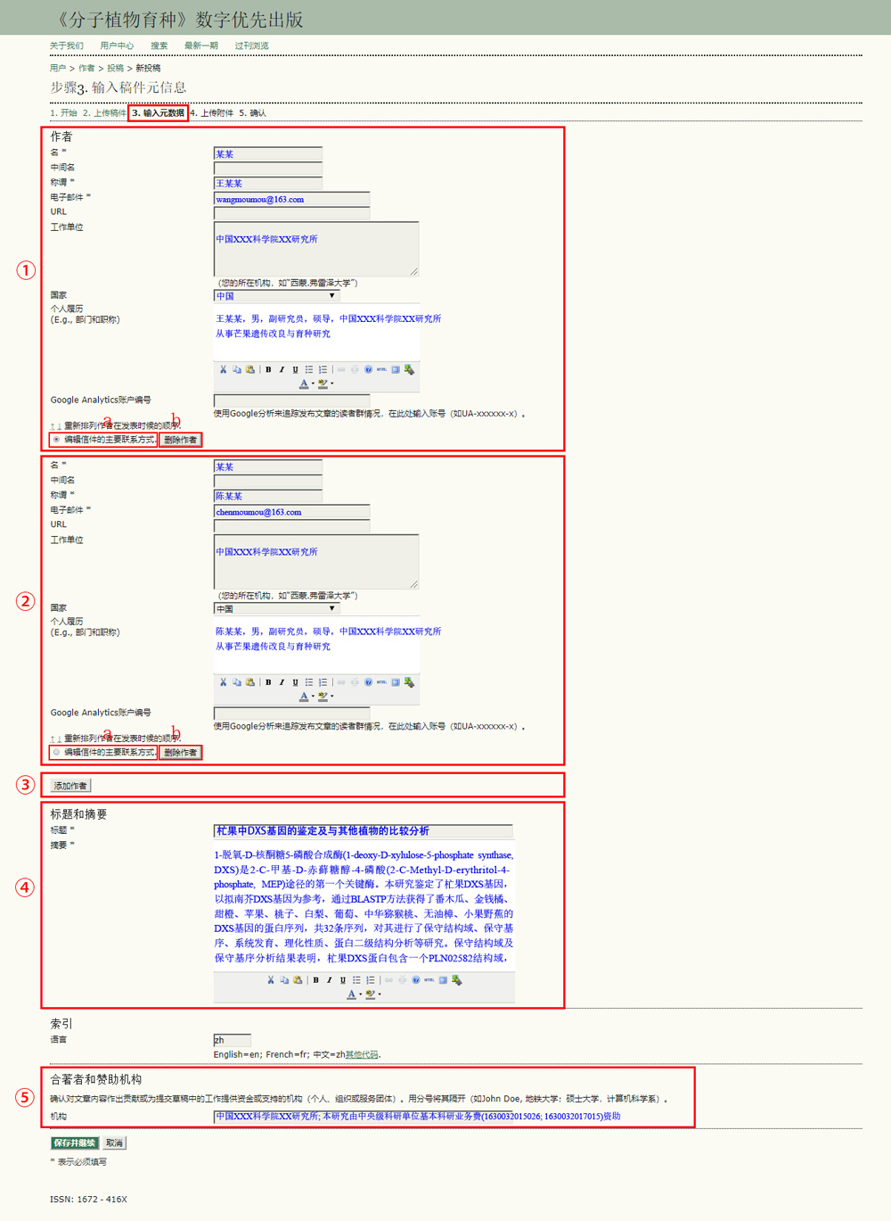 3、输入元数据:本刊投稿第三步,录入输入元数据,包括所有作者信息,题目和摘要、合著者、赞助机构和资助信息。如图所示:①处,录入名“某某”,称谓“王某某”,电子邮件“wangmoumou@163.com”,工作单位“中国XXX科学院XX研究所”,国家“中国”,个人履历“王某某,男,副研究员,硕导,中国XXX科学院XX研究所,从事芒果遗传改良与育种研究”。a处为设置本论文通信作者,b处为删除本条作者所有信息。②和①填写信息方法一致。③处,是增加作者,填写作者信息,方法如①(如多作者,点击③处增加作者信息)。④处,填写论文题目和摘要。⑤处,是填写合著者、赞助机构和资助信息。所有蓝色字体是必填项。