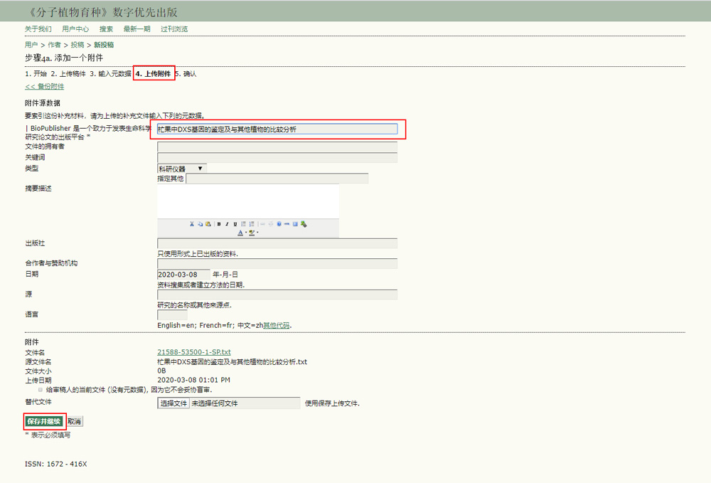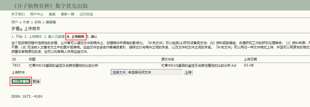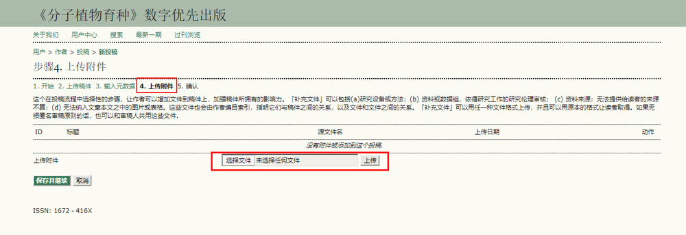 4、输入元数据:本刊投稿第四步,上传附件。如上传资料:a)研究材料或方法;(b) 资料数据;(c)参考文献原件;(d) 图片和表格。上传窗口如下图所示。