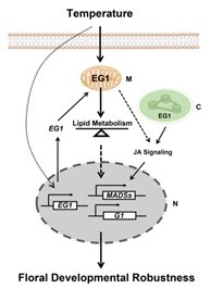 研究人员通过对水稻eg1突变体的研究,发现eg1突变体在不同的生长环境下花器官呈现显著的表型差异,表明EG1的突变影响了水稻花器官的稳态发育。生理生化实验表明EG1是一个主要在线粒体定位的脂酶,其转录水平、蛋白稳定性和酶活性都具有高温依赖特性。重要的是EG1能够抑制大量下游基因在转录水平对环境的响应,其中包括一系列花器官特性决定基因。进一步的遗传分析证明花器官决定基因OsMADS1, OsMADS6和OsG1作用于EG1的下游来保证花器官的稳态发育。这些结果表明EG1通过介导一条高温依赖的线粒体脂酶途径来保证花器官决定基因的正常表达,进而促进在不同环境中花器官的稳态发育。