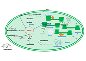 叶绿素是最重要的有机化合物。关于叶绿素的合成研究多集中在其卟啉环的代谢过程,而对其植烯侧链的供应了解很少。植烯来自于叶绿体中的GGPP,但是GGPP同时也是植物三种激素(赤霉素、脱落酸、独脚金内酯)以及类胡萝卜素等重要生理物质的合成前体。这些合成过程分布于叶绿体的基质和类囊体等不同区室中。植物如何精确调配GGPP供应,以同时满足不同物质的合成,始终令人困惑,也是很多代谢调控工作无法绕过的问题。