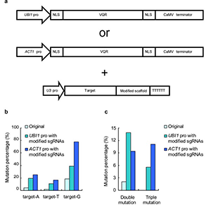 CRISPR-Cas9系统已经广泛应用于基因组编辑。但是该系统在进行基因组编辑时,除需要特异识别靶序列之外,还需要特异识别一段NGG的邻近核苷酸序列,这大大限制了该系统的编辑位点选择范围。在前期的研究中,课题组通过对Cas9蛋白进行定点突变,获得了Cas9蛋白的VQR变体,并在水稻基因组中成功实现对NGA邻近序列的编辑,极大的扩展了基因编辑位点的选择范围(Hu et al., 2016. molecular Plant),然而CRISPR-Cas9-VQR系统与原CRISPR-Cas9系统相比较,其编辑效率依然偏低,这限制了该系统在水稻中的推广应用,为此,本研究通过优化sgRNA的结构以及使用水稻內源性强启动子来驱动VQR变体的表达,成功将CRISPR-Cas9-VQR系统的编辑效率提高到了原有系统的3到7倍。