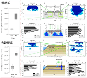 为定量评价不同形态特征的植物根系对土壤水分入渗运移行为的影响,中国科学院西双版纳热带植物园生态水文研究组助理研究员蒋小金、研究员刘文杰等选取橡胶树的细根系(云南省热带区)、互米花草的光滑根系(江苏省滩涂地)、玉米的须根系(甘肃省农耕地)为研究对象,采用染色示踪等方法对土壤导水率、水分运移行为和分布格局等进行了相关实验,并对入渗参数、土壤物理性质之间的关系做了冗余分析。结果表明,不同形态的根系对土壤物理性能和水分运移行为的影响不同。在农耕土壤中,玉米须根系使得土壤饱和导水率(Ks)、非毛管孔隙度(Øn)分别增加了252%、26%,水分在须根系诱导下优先渗入土壤,其后的足量水分储存在孔隙良好的耕作层中,为玉米生长用水提供了保障;在滩涂土壤中,容重高、导水率低的淤泥层阻挡了水分下渗、导致了大量地表径流,而在互米花草光滑根系生长处的土壤饱和导水率(Ks)、非毛管孔隙度(Øn)则分别增加了93%、92%,光滑根系轻易地穿透了淤泥层、诱导了水分的快速下渗、诱发了优先流和淤泥层间的侧流(层间高导水率的沙壤土所致),为水分(降雨)及时从海岸排放到海洋提供了保障。在热带土壤中,单作橡胶林的管理方式导致了土壤容重增加、雨水入渗缓慢,但在细根系处的土壤饱和导水率(Ks)、非毛管孔隙度(Øn)则分别增加了96%、234%,细根系诱导了雨水快速入渗到深层土壤、大量储存于土壤孔隙中,即细根系诱发的水分分布格局保障了橡胶树对土壤水分的及时需求。