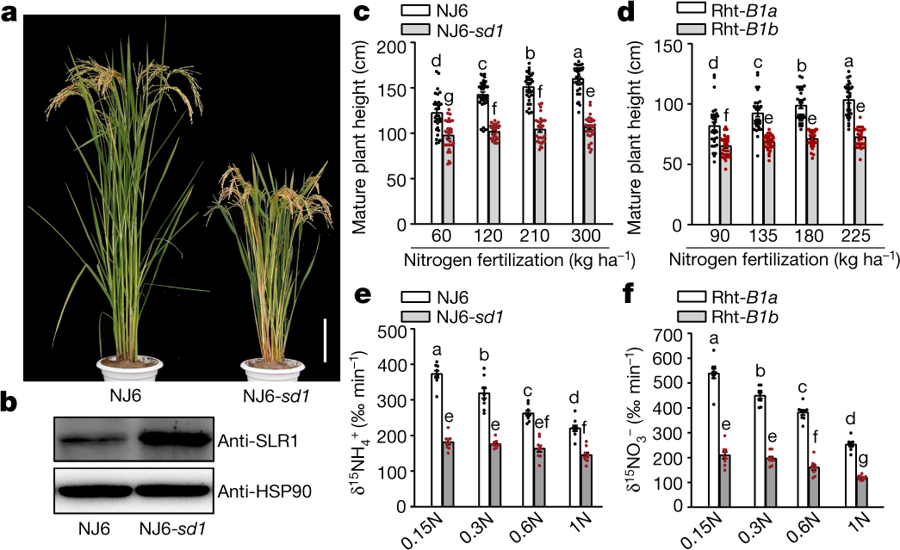 以半矮秆新品种培育为标志的“绿色革命”带来了全球粮食的增产,但这些半矮化品种中抑制植物生长的DELLA蛋白大量积累,降低了农作物对氮素的吸收利用效率。