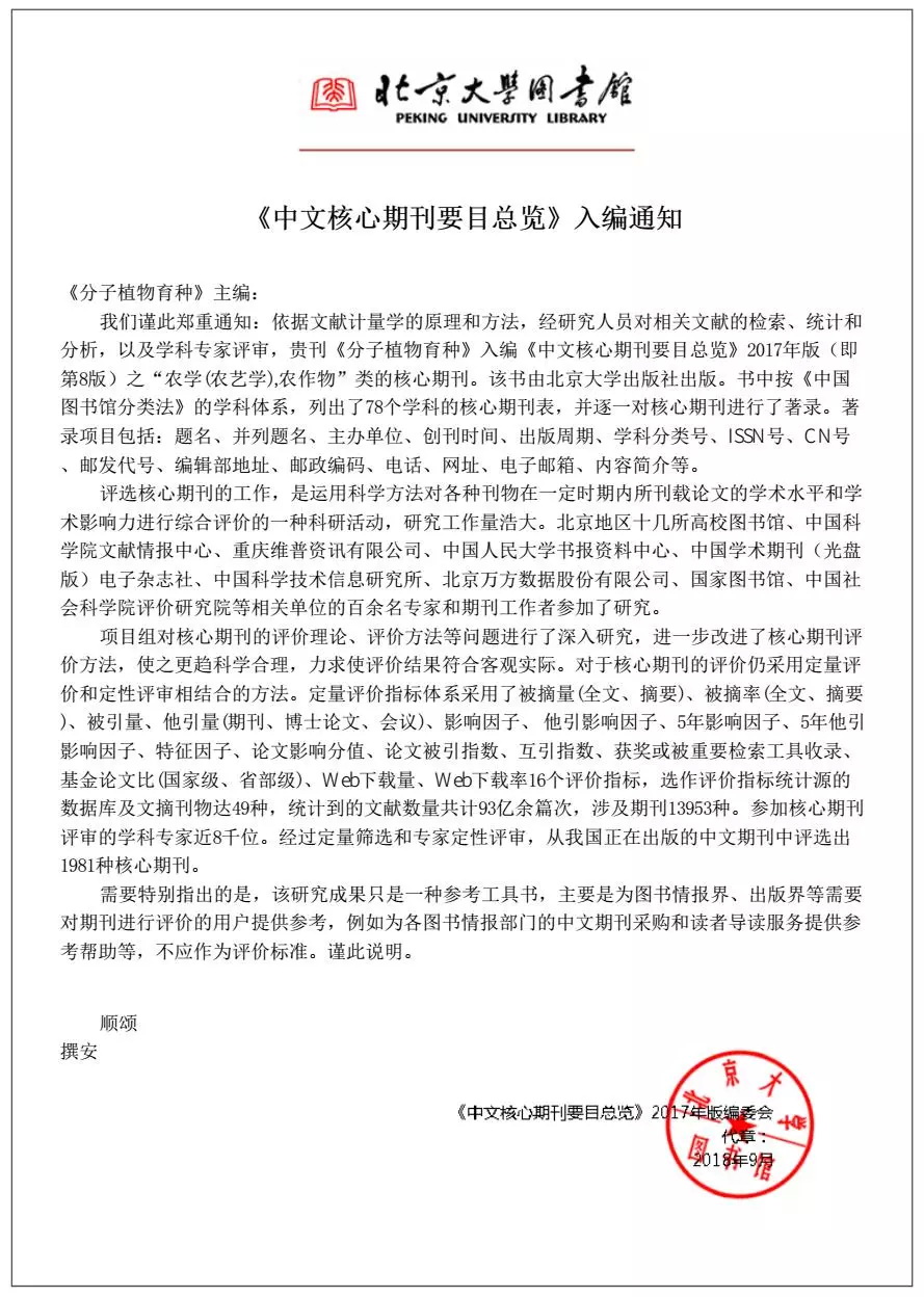 日前,北京大学图书馆郑重通知《分子植物育种》入编《中文核心期刊要目总览》2017年版(即第8版)之“农学(农艺学),农作物”类的核心期刊。这是我刊自2011年以来连续第3次入选北京大学《中文核心期刊要目总览》。